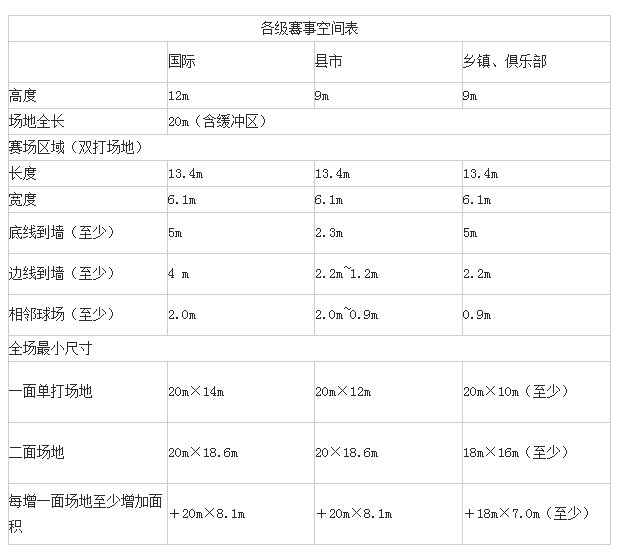 按行業比賽規定,整個球場上空空間 低為9米,在這個高度以內,不得有任何橫梁或其它障礙物,球場四周2米以內不得有任何障礙物。任何并列的兩個球場之間, 少應有2米的距離。球場四周的墻壁 好為深色,不能有風。